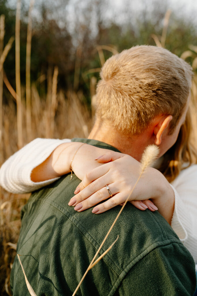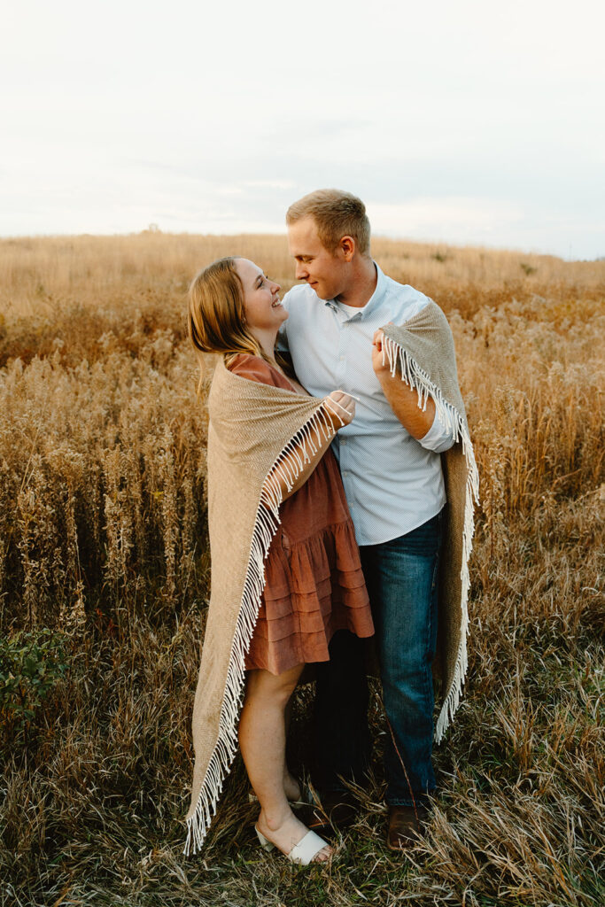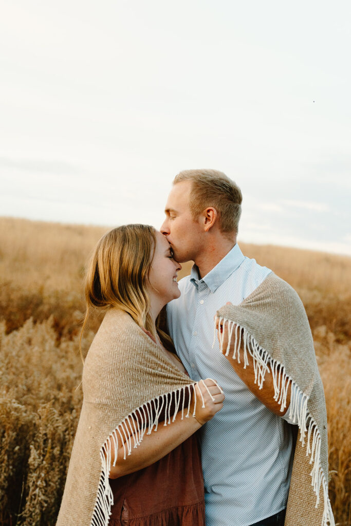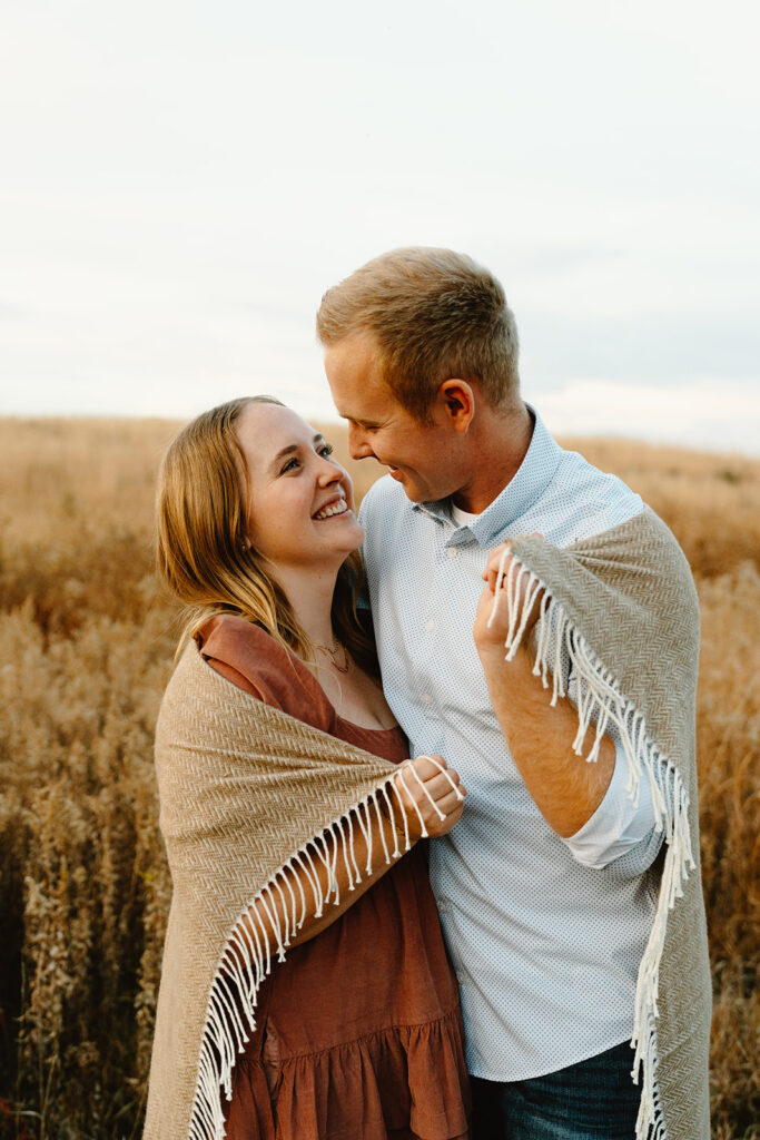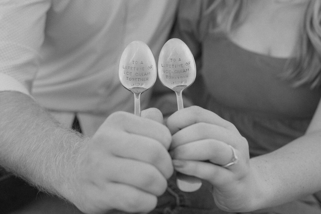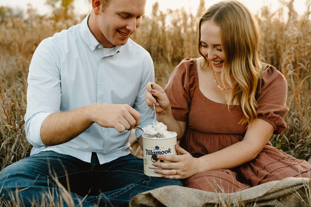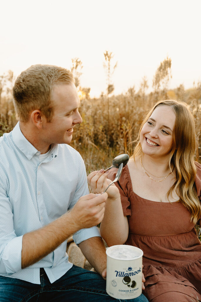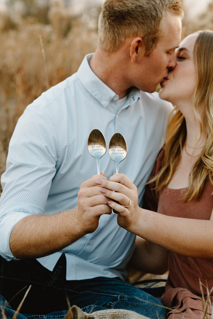 Finally, for their engagement session we chose a quiet field in Omaha. It had wide-open skies, soft wind, and golden grass swaying around them. Jack and Faith brought their favorite ice cream to share along with custom engraved spoons! It was such a fun, personal touch. They laughed, fed each other bites of cookies and cream, and settled into the moment like it was second nature. As golden hour set in, everything just glowed. They ran through the field, held hands, spun in circles, and wrapped up in a cozy blanket to close out the day. They didn’t need posing, they were simply themselves! Playful, affectionate, full of love.